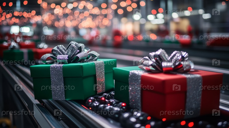 Красочные подарки движутся по конвейерной ленте в окружении сверкающих праздничных огней и украшенной рождественской елки, создавая праздничный дух