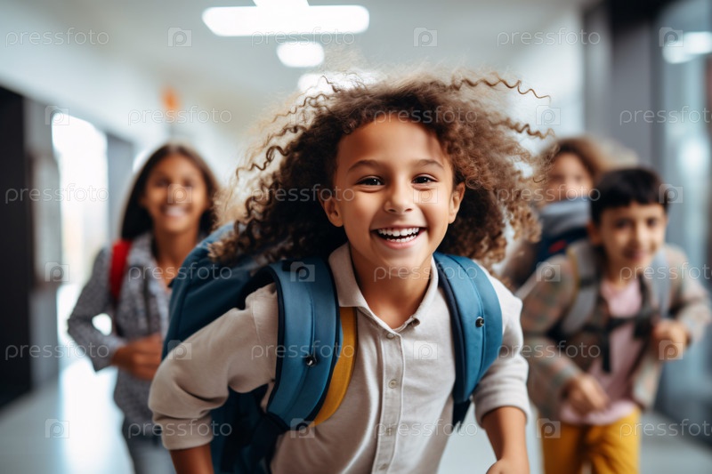 Радостные школьники бегут по коридору, возбужденные и энергичные