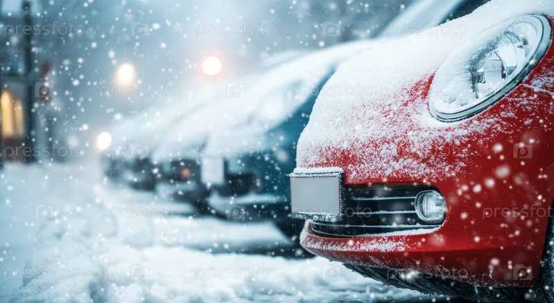 Снег покрывает живописный город, превращая улицы в зимнюю страну чудес, где машины и здания демонстрируют красоту этого времени года