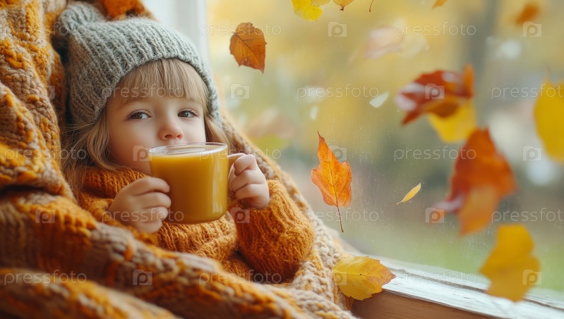 Ребенок, закутанный в уютный свитер, наслаждается теплой чашкой чая у окна, любуясь нежной красотой падающих осенних листьев, наслаждаясь безмятежным осенним мгновением