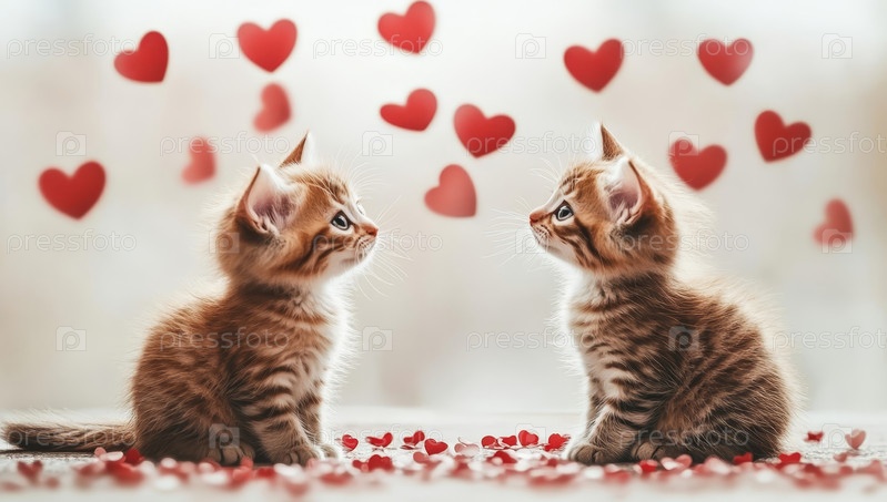 Два пушистых котенка смотрят на висящие сердца, окруженные красными огнями боке, в очаровательной романтической сцене, идеально подходящей для тематики Дня святого Валентина