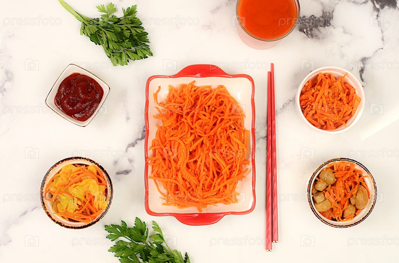 Корейский гарнир из кимчи для барбекю, морковь с соусом и острым перцем, набор ферментированных продуктов, полезных для здоровья кишечника. Морковь, капуста, чеснок, петрушка и сок на бетонном фоне,