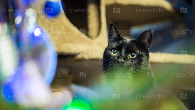 Черный кот с удивлением смотрит на рождественскую елку с праздничными огнями