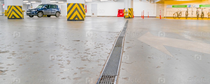Пустая подземная парковка, фокус на переднем плане, размытый фон