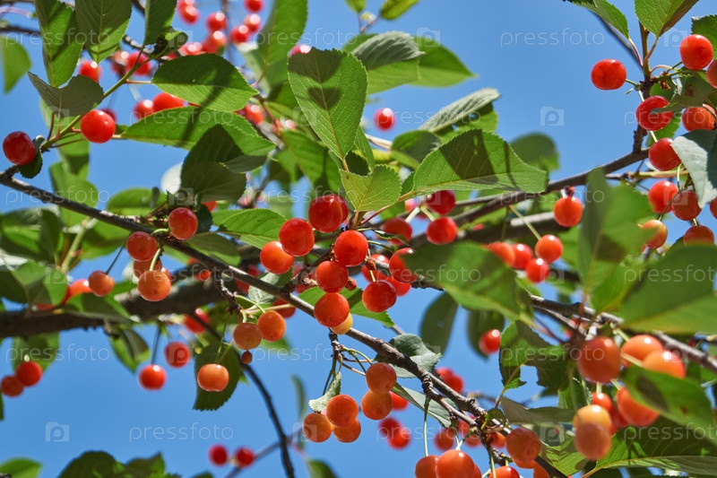 Вишня на фоне голубого неба и зеленых листьев. Вишня зреет в саду