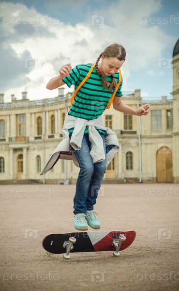 Девушка катается на скейтборде в городе