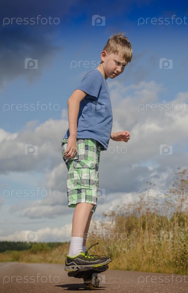 Мальчик катается на скейтборде по дороге
