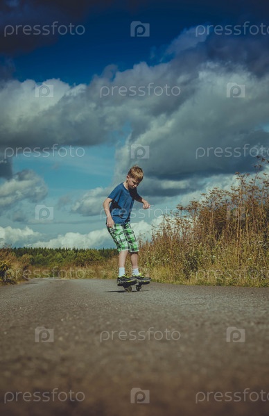 Мальчик катается на скейтборде по дороге