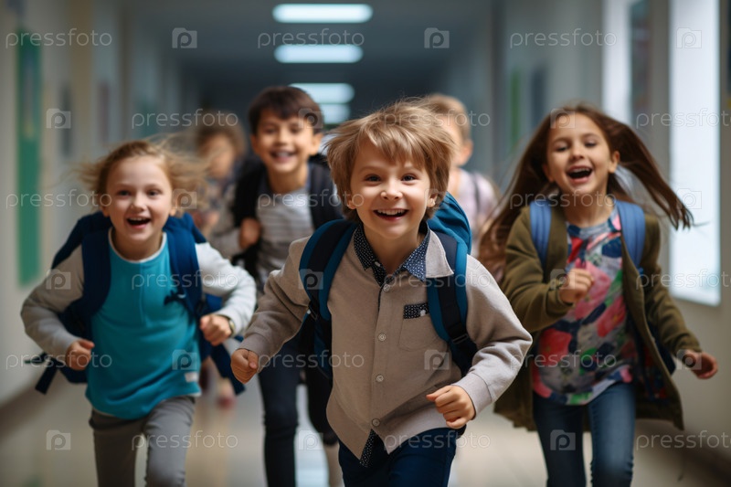 Радостные школьники бегут по коридору, возбужденные и энергичные