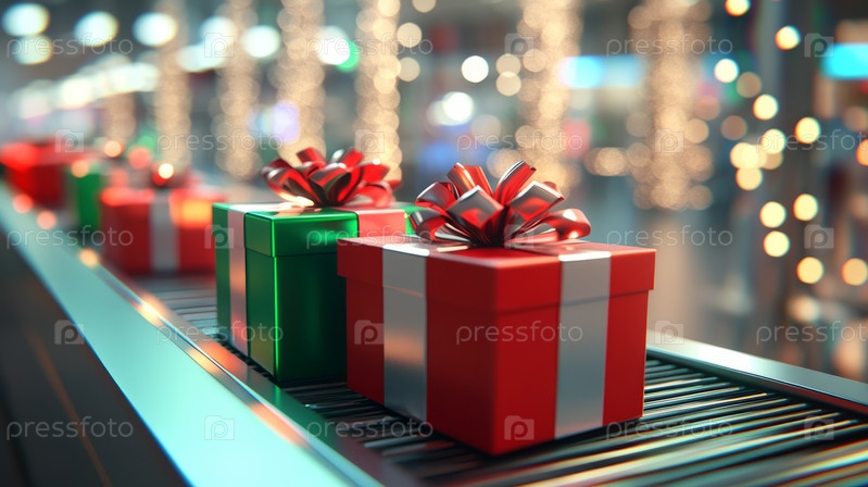 Праздничные подарки на конвейере среди рождественских огней