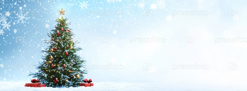 Покрытая снегом рождественская елка безмятежно возвышается на фоне огромного снежного пейзажа, украшенная игрушками и увенчанная сияющей звездой