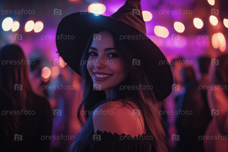 Человек, одетый как ведьма, наслаждается праздничной ночью во время многолюдного уличного празднования Хэллоуина, освещенного яркими огнями