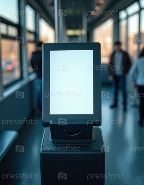 Киоск самообслуживания стоит на остановке общественного транспорта, освещенный среди суеты пассажиров. Он предназначен для быстрой покупки билетов и транзакций. Генеративный ИИ