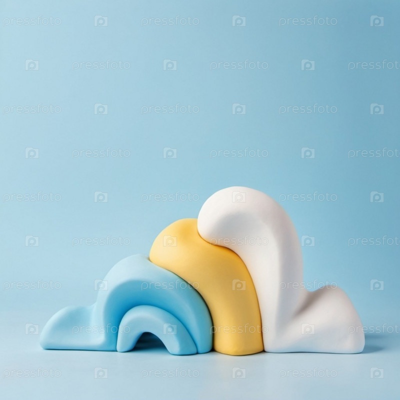 В яркой сине-белой обстановке уникальные абстрактные формы выстраиваются в игривую формацию. Мягкие изгибы и яркие цвета вызывают ощущение креативности и современного искусства. Генеративный ИИ
