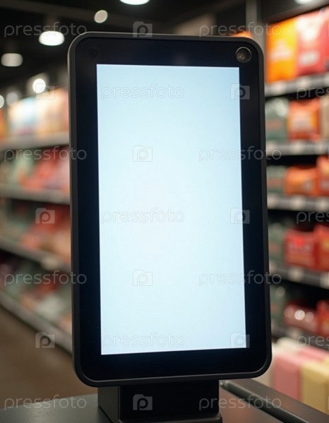 В оживленном супермаркете стоит кассовый киоск самообслуживания с пустым экраном, приглашающий клиентов эффективно совершать покупки. Генеративный ИИ