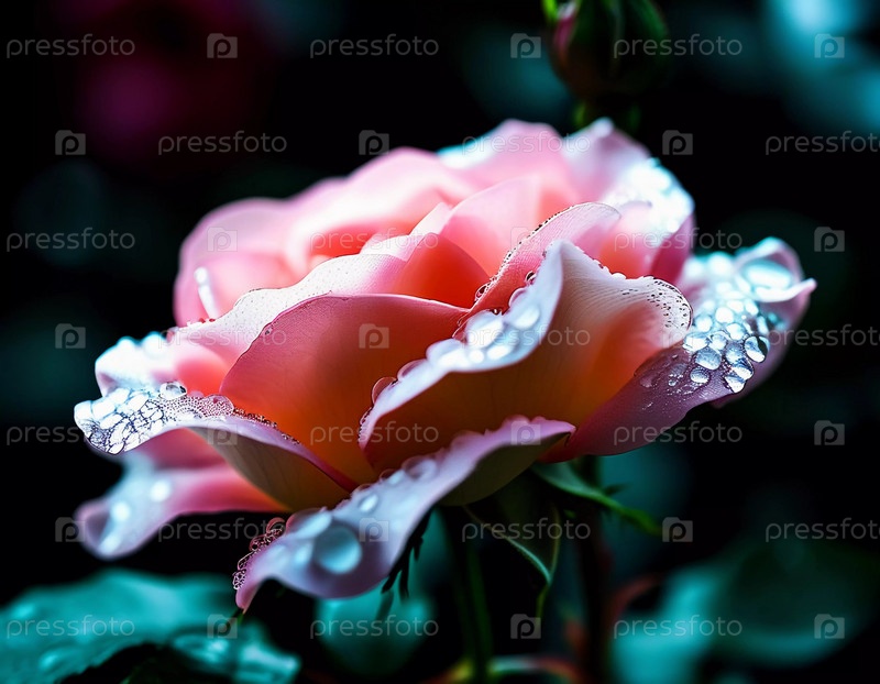 Прекрасная розовая роза с мягкими лепестками блестит капельками росы в пышном саду, освещенном нежным светом раннего утра. Генеративный ИИ