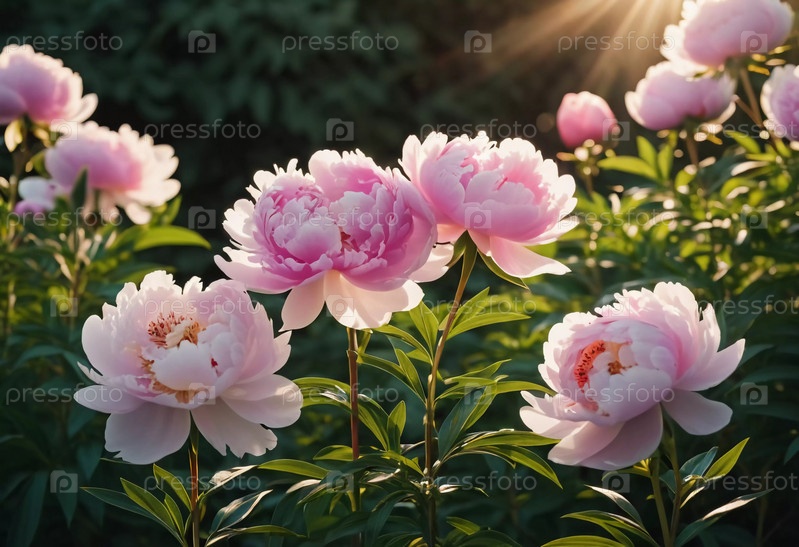 Яркие цветы пиона в оттенках розового возвышаются на фоне золотистого заката на заднем плане, создавая безмятежный и атмосферный пейзаж, наполненный теплом. Генеративный ИИ