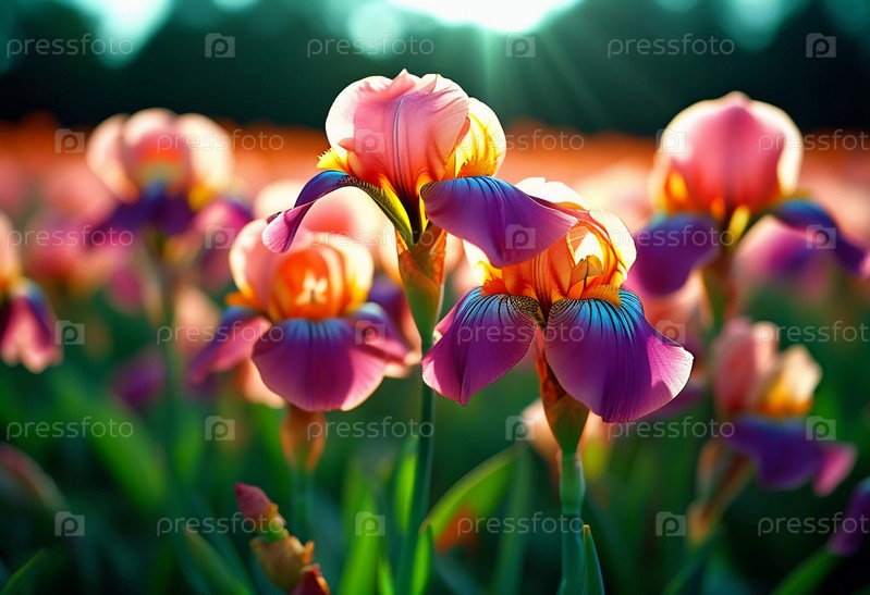 Яркий сад, полный цветущих ирисов, ярко сияет на закате, отбрасывая теплые тона на красочные цветы и пышную зелень. Генеративный ИИ