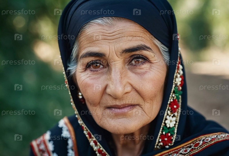 Зрелая 75-летняя таджикская женщина смотрит прямо, демонстрируя сложную традиционную одежду, богатое культурное наследие своей национальности, пробуждая мудрость и изящество