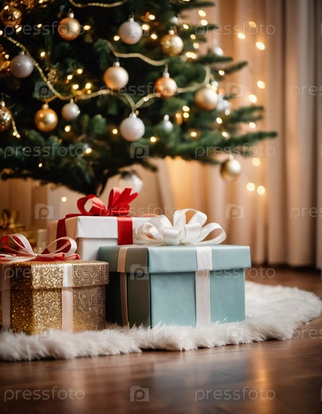 Празднично упакованные подарки, окруженные красочными рождественскими шарами под красиво украшенной елью во время радостного новогоднего сезона. Генеративный ИИ
