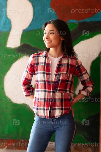 Портрет молодой красивой женщины в красной клетчатой рубашке в студии