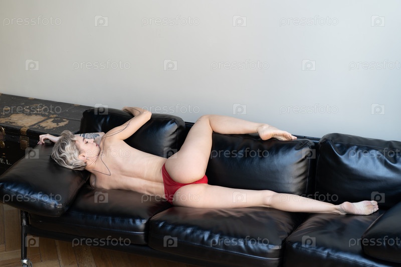 Молодая красивая женщина позирует в красном нижнем белье в студии