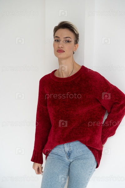 Молодая красивая женщина позирует в красном свитере в студии