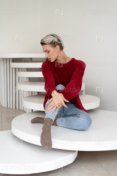 Молодая красивая женщина позирует в красном свитере в студии