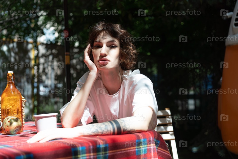 Молодая красивая женщина сидит за столом летом в саду