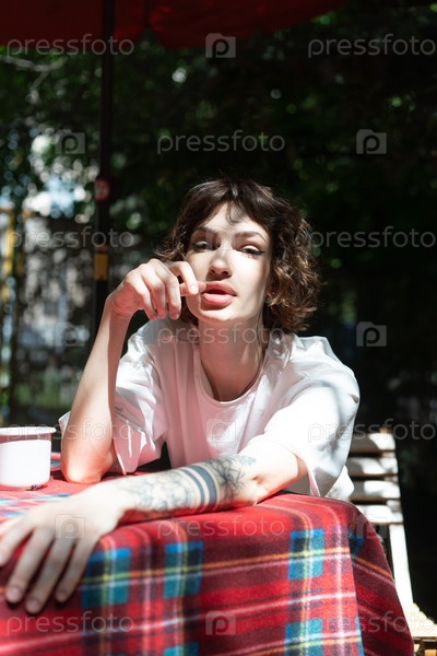 Молодая красивая женщина сидит за столом летом в саду