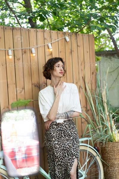 Молодая красивая женщина позирует на улице летом, стоя рядом с велосипедом