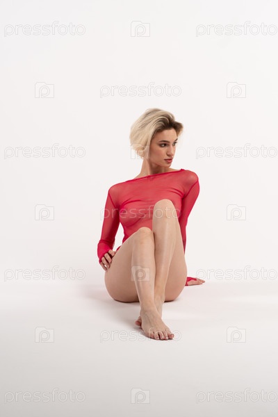 Молодая красивая женщина позирует в красном нижнем белье в студии