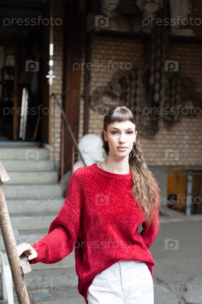 Молодая красивая женщина позирует в красном свитере на улице
