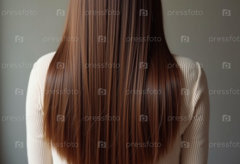 Гладкие, прямые коричневые волосы элегантно тянутся вниз по спине, подчеркивая их здоровый блеск и равномерный цвет, освещенные мягким освещением, создавая эффектный вид. Уход за волосами, эффект косметики. AI