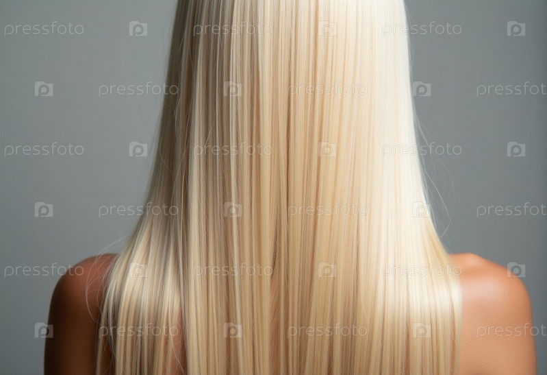 Гладкие, прямые светлые волосы элегантно протекают по спине, подчеркивая их здоровый блеск и равномерный цвет, освещенные мягким освещением, создавая эффектный вид