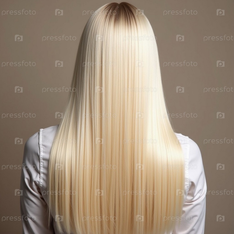 Гладкие, прямые светлые волосы элегантно протекают по спине, подчеркивая их здоровый блеск и равномерный цвет, освещенные мягким освещением, создавая эффектный вид