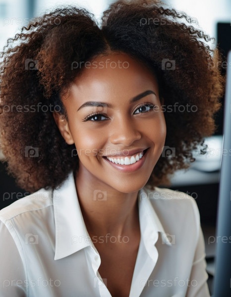 Профессиональная женщина с вьющимися черными волосами, одетая в белую рубашку, сидит за своим столом в современном офисе, излучая уверенность и позитив. Окружающая среда усиливает ее доступное поведение. ИИ