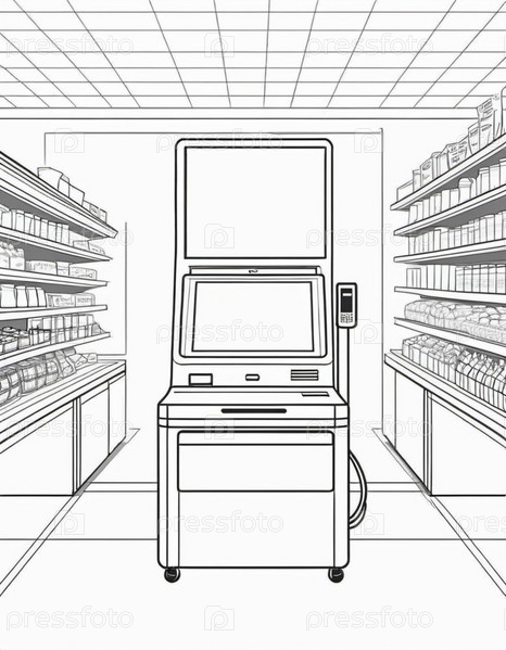 Станция самообслуживания кассы занимает видное место в проходе супермаркета, заполненном полками, заполненными разнообразными продуктами. Клиенты могут быстро сканировать и оплачивать товары. Генеративный ИИ