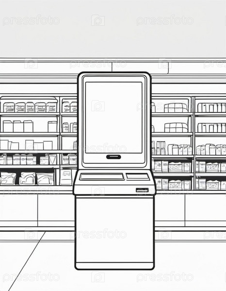 Киоск самообслуживания готов к использованию покупателем в супермаркете. Окружающие полки демонстрируют разнообразные продукты, что указывает на оживленную атмосферу покупок. Генеративный ИИ