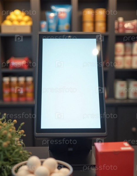 В оживленном супермаркете стоит кассовый киоск самообслуживания с пустым экраном, приглашающий клиентов эффективно совершать покупки. Генеративный ИИ