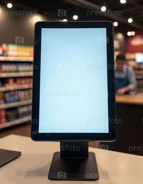 В оживленном супермаркете стоит кассовый киоск самообслуживания с пустым экраном, приглашающий клиентов эффективно совершать покупки. Генеративный ИИ