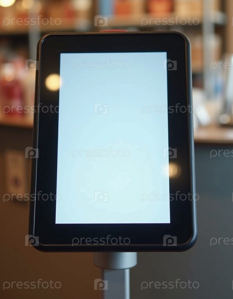 В оживленном супермаркете стоит кассовый киоск самообслуживания с пустым экраном, приглашающий клиентов эффективно совершать покупки. Генеративный ИИ