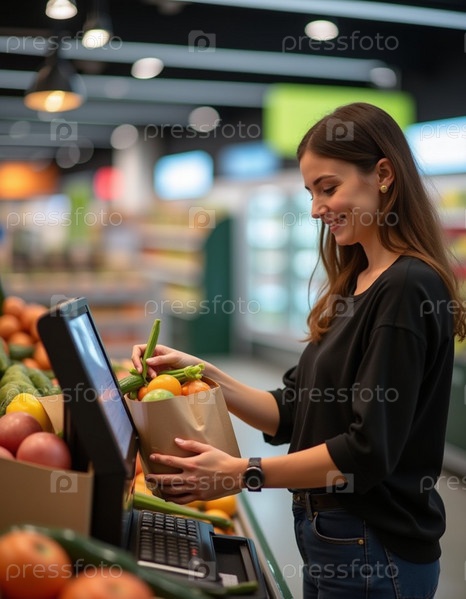 В ярко освещенном продуктовом магазине женщина с длинными волосами улыбается, кладя свежие овощи в пакет и пользуясь кассой самообслуживания. Генеративный ИИ