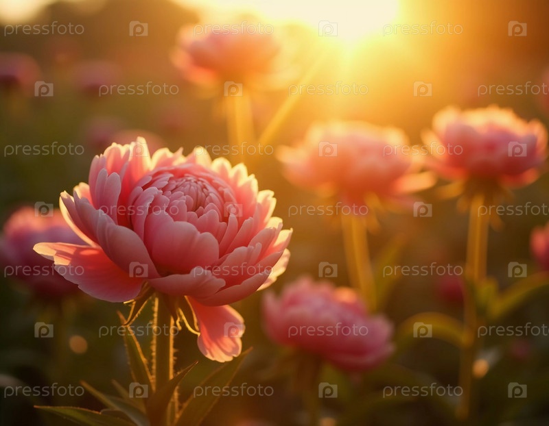 Яркие цветы пиона в оттенках розового возвышаются на фоне золотистого заката на заднем плане, создавая безмятежный и атмосферный пейзаж, наполненный теплом. Генеративный ИИ