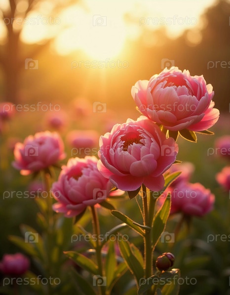 Яркие цветы пиона в оттенках розового возвышаются на фоне золотистого заката на заднем плане, создавая безмятежный и атмосферный пейзаж, наполненный теплом. Генеративный ИИ
