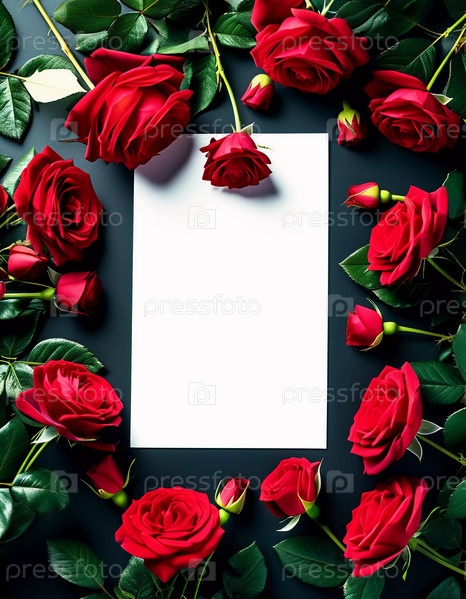 Окруженная пышной зеленой листвой, пустая карточка лежит среди прекрасных красных роз, создавая романтическую атмосферу, усиленную мягким освещением, идеально подходящую для особых сообщений. Генеративный ИИ