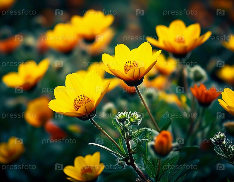 Яркие желтые цветы портулака цветут в саду, демонстрируя свои нежные лепестки на фоне пышной зеленой листвы под ярким солнцем. Генеративный ИИ