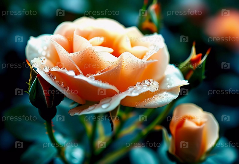 Прекрасная розовая роза с мягкими лепестками блестит капельками росы в пышном саду, освещенном нежным светом раннего утра. Генеративный ИИ