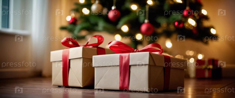 Уютная гостиная, украшенная праздничной рождественской елкой, украшенной сверкающими огнями и красочными безделушками, окруженная множеством тщательно упакованных подарочных коробок, ожидающих открытия. Искусство ИИ