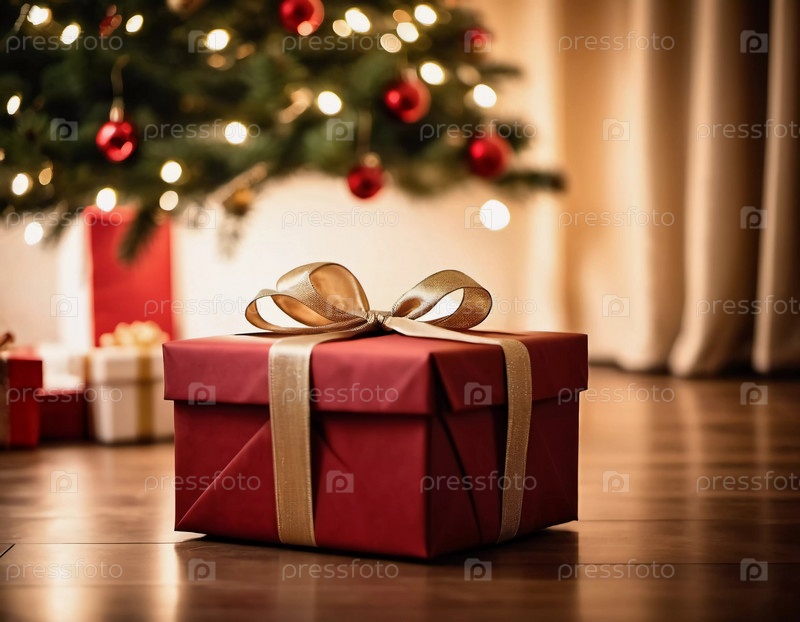 Уютная гостиная, украшенная праздничной рождественской елкой, украшенной сверкающими огнями и красочными безделушками, окруженная множеством тщательно упакованных подарочных коробок, ожидающих открытия. Искусство ИИ